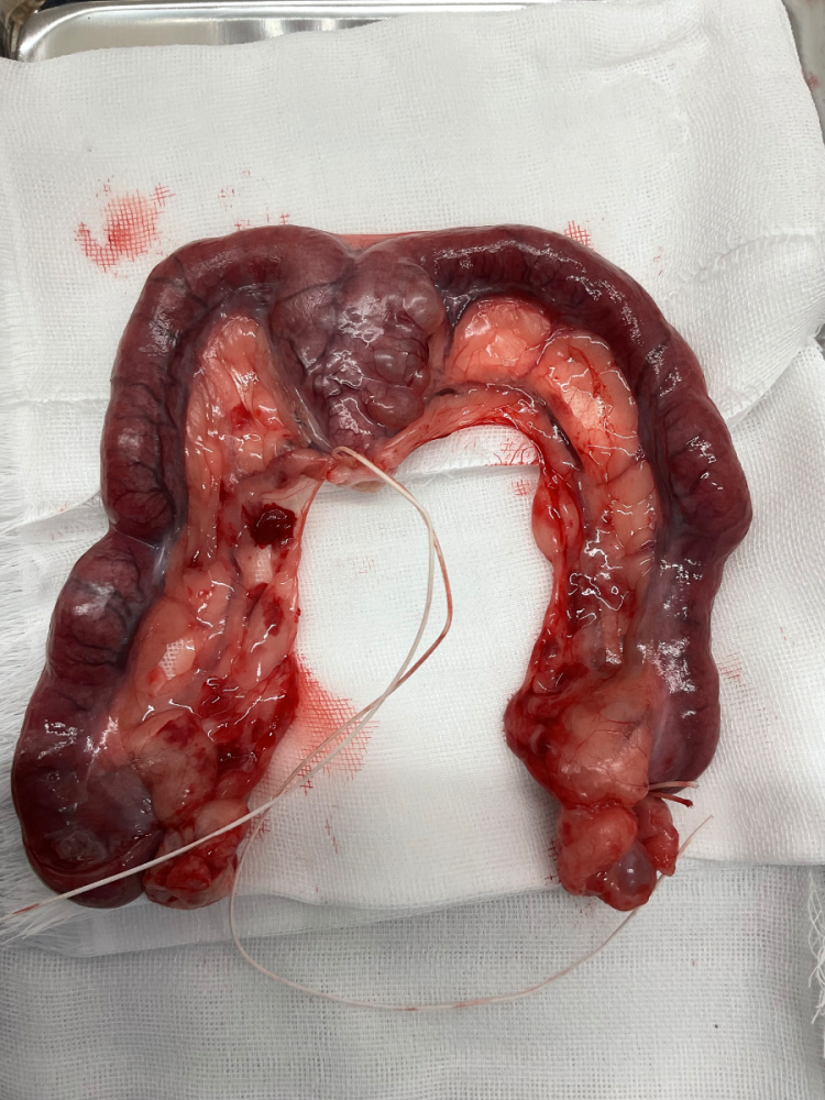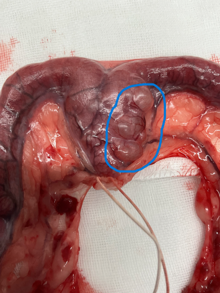 飼い主様とご相談のうえ、子宮・卵巣摘出手術(不妊化手術)を選択しました。また、嚢胞状の病変が悪性でないことを確認するため、摘出組織を病理組織検査に出しました。