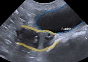 青で囲っている部位が膀胱(おしっこが黒く映っています)黄色の線が子宮になります(子宮内の液体が黒く映っています)※超音波画像では液体が黒く映ります。